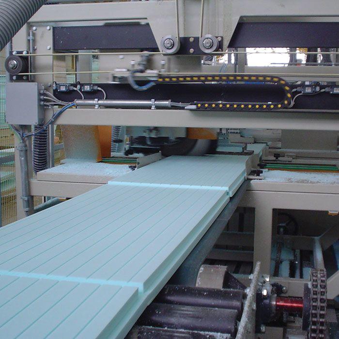 Плиты XPS выпускаются двух видов: с прямыми кромками и с кромкой L-образной формы. В первом случае применения устройства для торцевания не требуется. Во втором случае по торцам плиты нарезаются канавки, благодаря которым улучшается сцепление при стыковке двух плит. Установка для торцевания включает в себя подвижное лезвие, прижимные ролики и мотор.